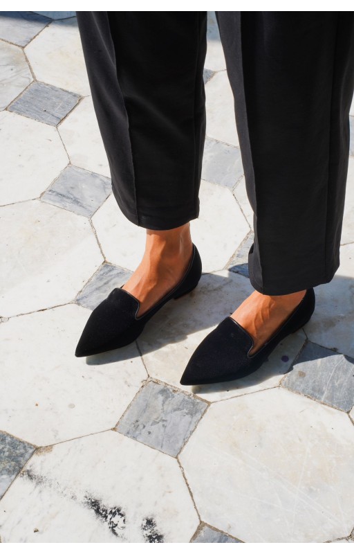 Modello friulana con tessuto in velluto nero. La suola è in vero cuoio ed azzurra, caratteristica del brand.