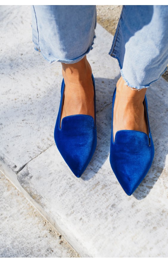 Modello friulana con tessuto in velluto blu. La suola è in vero cuoio ed azzurra, caratteristica del brand.